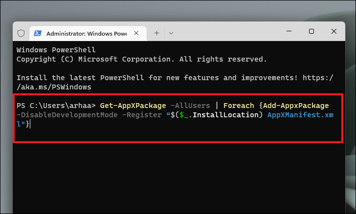 Get-AppXPackage -AllUsers | Foreach {Add-AppxPackage -DisableDevelopmentMode -Register "$($_.InstallLocation)\AppXManifest.xml"}