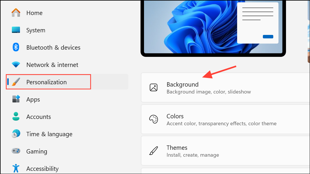 Step 1: Open the Windows Settings app by pressing Windows + I on your keyboard. Click on Personalization in the left sidebar, then select Background.