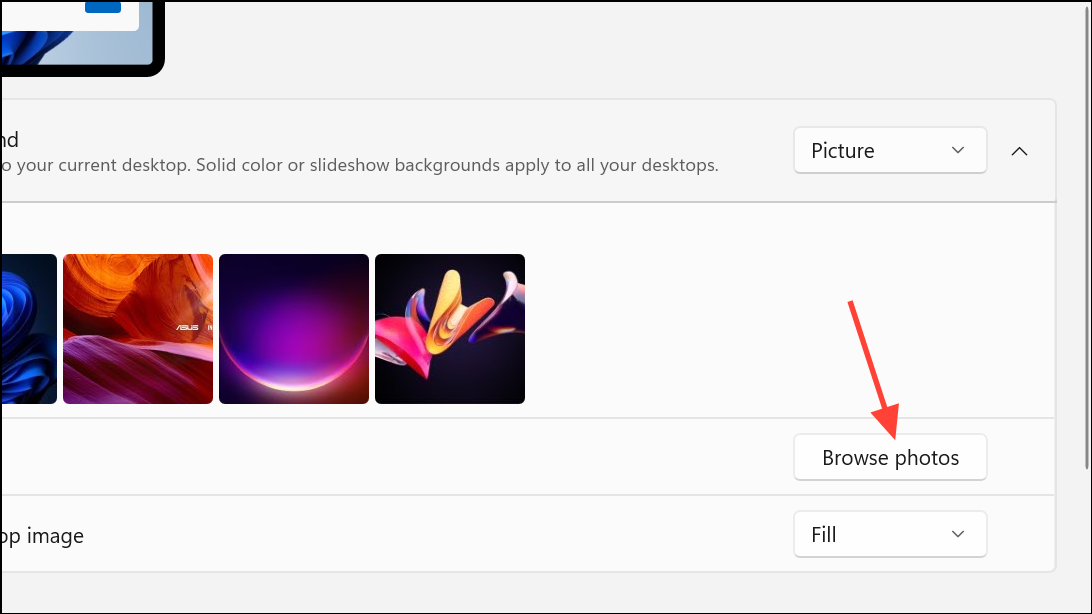 Step 3: Below the dropdown, select your preferred wallpaper from the provided images or click Browse to choose a custom image from your files. This ensures Windows uses your selected image as the desktop background.