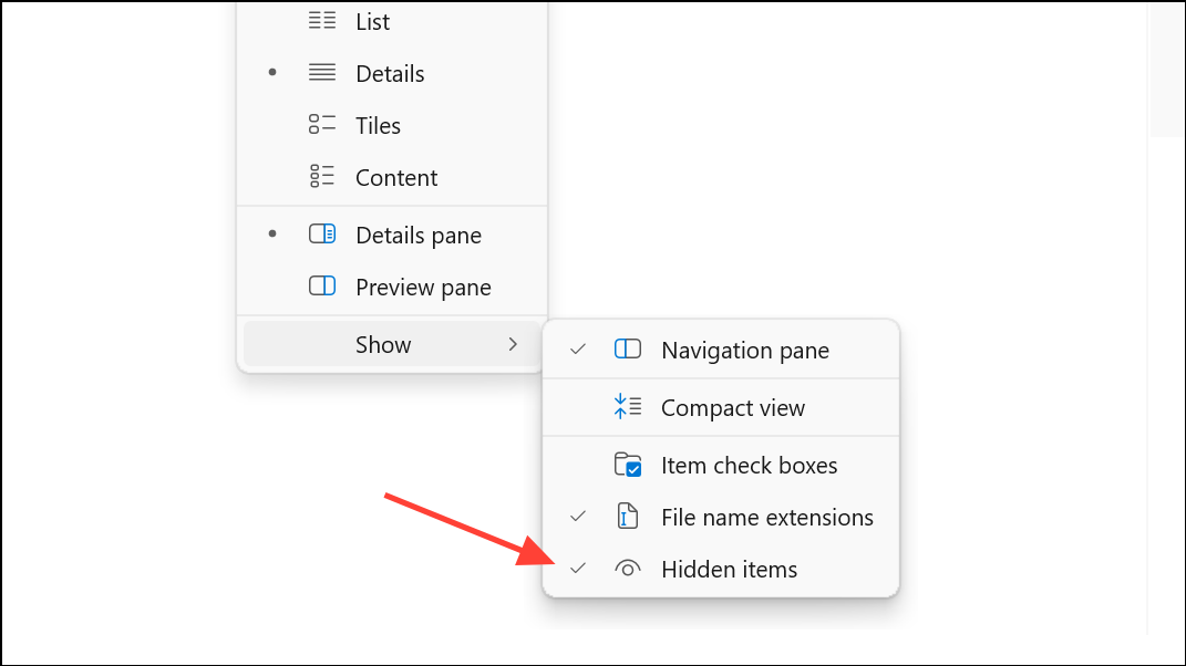 Step 1: Open File Explorer and enable hidden items as described above.