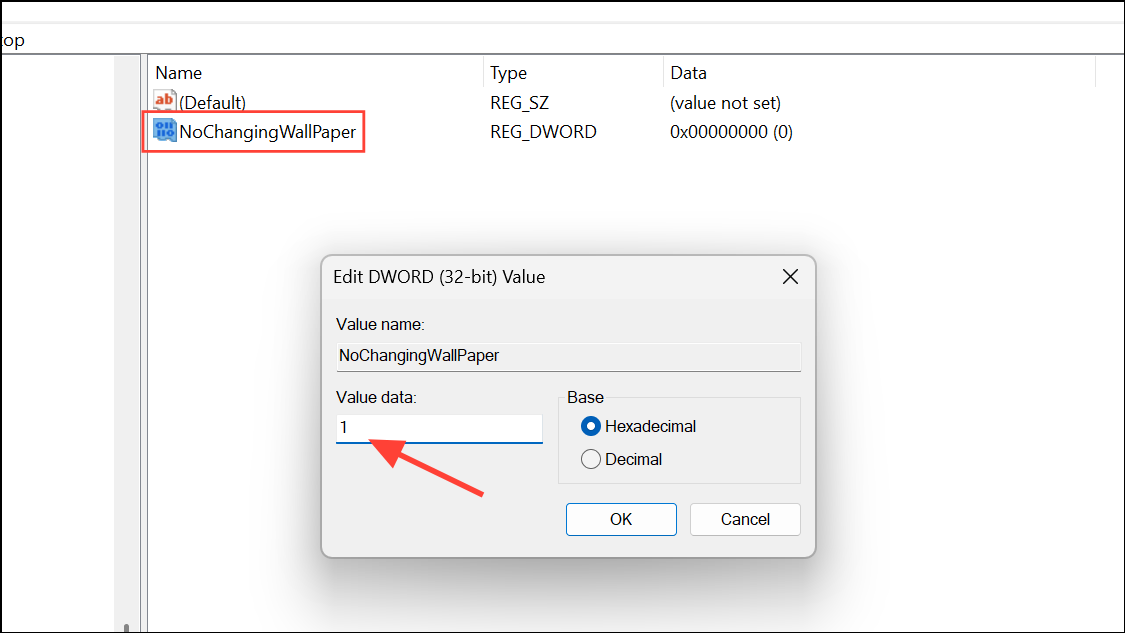 Step 5: Double-click NoChangingWallPaper, set its value to 1, and click OK. Close the Registry Editor and restart your computer. Your wallpaper selection will now be locked in place.