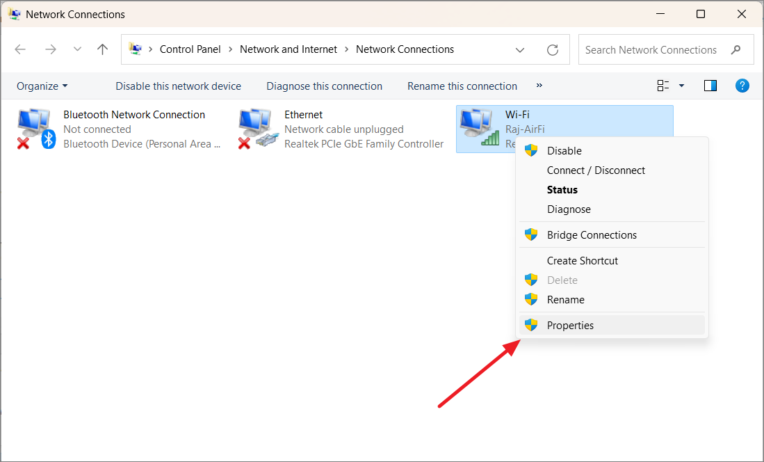 Step 2: In the Network Connections window, locate your Wi-Fi adapter. Right-click on it and select Properties from the context menu.