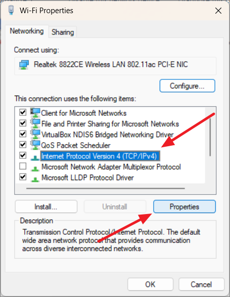 Step 3: In the Wi-Fi Properties window, scroll through the list and select Internet Protocol Version 4 (TCP/IPv4), then click on Properties.