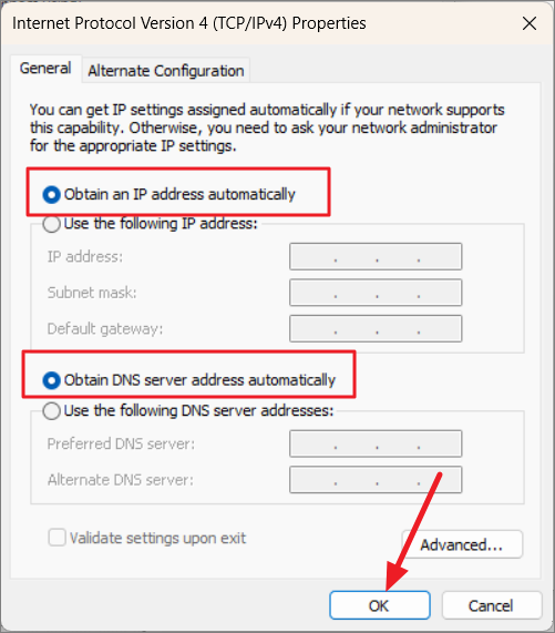 Step 4: Ensure that both Obtain an IP address automatically and Obtain DNS server address automatically are selected. Click OK to save the changes.
