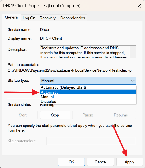 Step 3: In the Properties window, set the Startup type to Automatic. Click Apply to save the changes.
