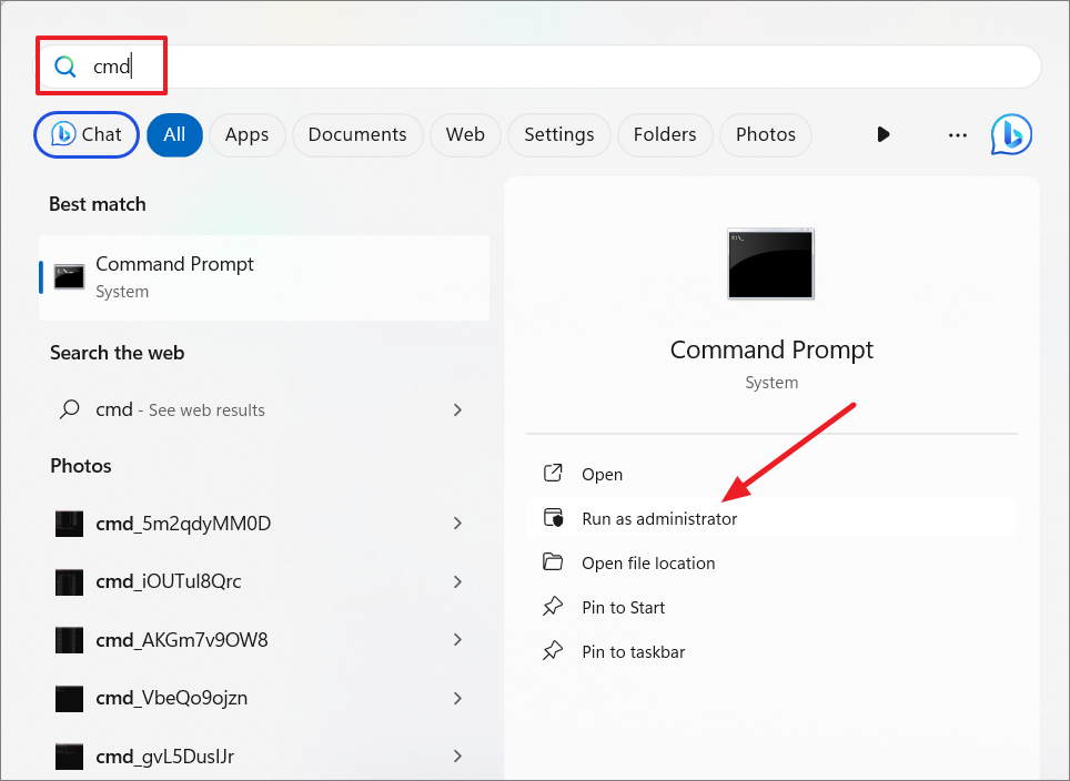Step 1: Click on the Start menu, type cmd, right-click on Command Prompt, and select Run as administrator.