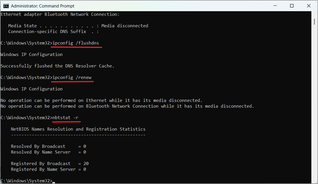 netsh winsock resetnetsh int ip resetipconfig /releaseipconfig /flushdnsipconfig /renewnbtstat -r