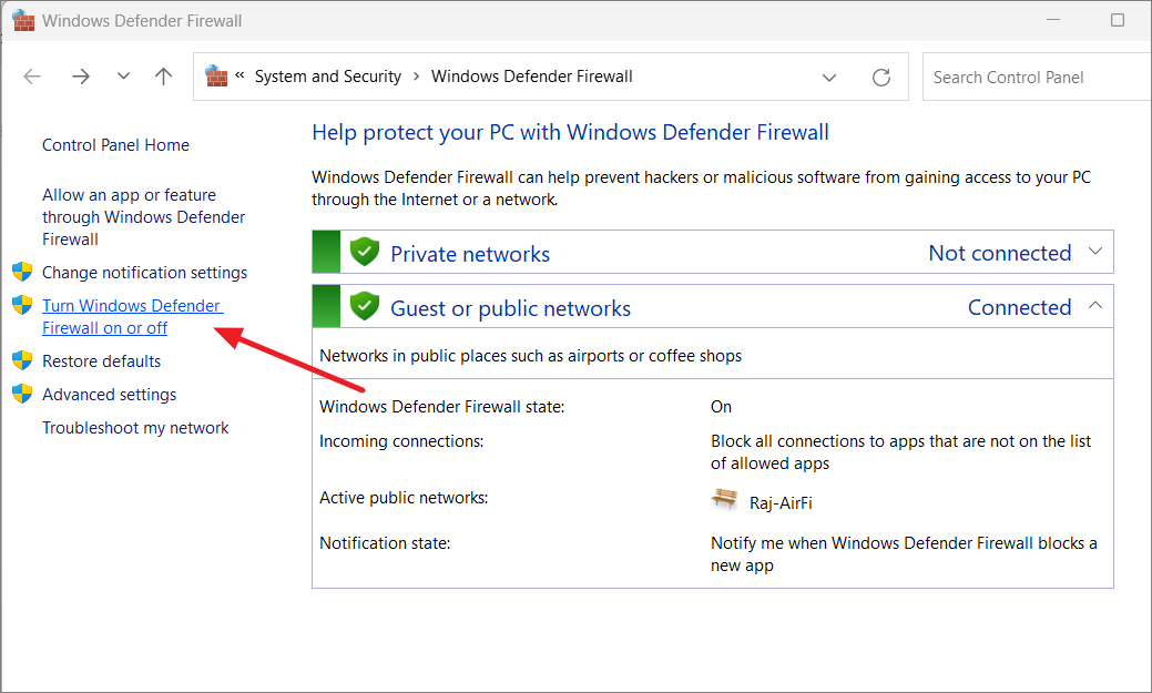 Step 3: Click on Turn Windows Defender Firewall on or off from the left pane.