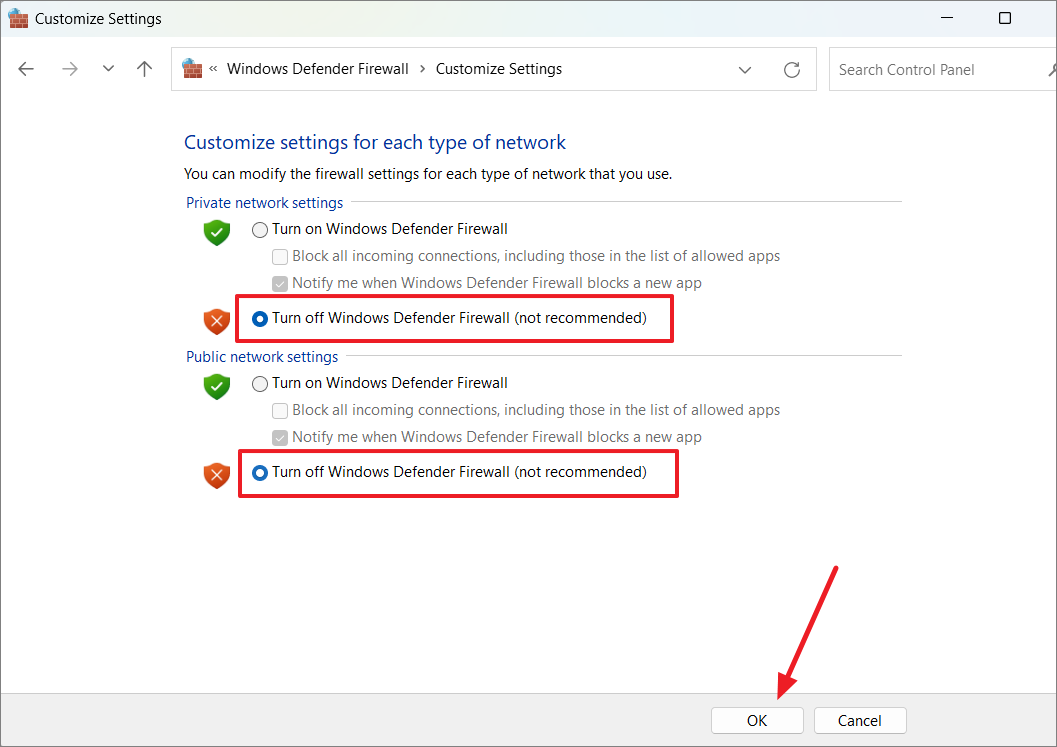 Step 4: Select Turn off Windows Defender Firewall (not recommended) for both Private and Public network settings. Click OK.