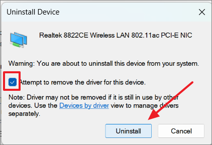Step 3: In the confirmation dialog, check the box for Attempt to remove the driver for this device and click Uninstall.