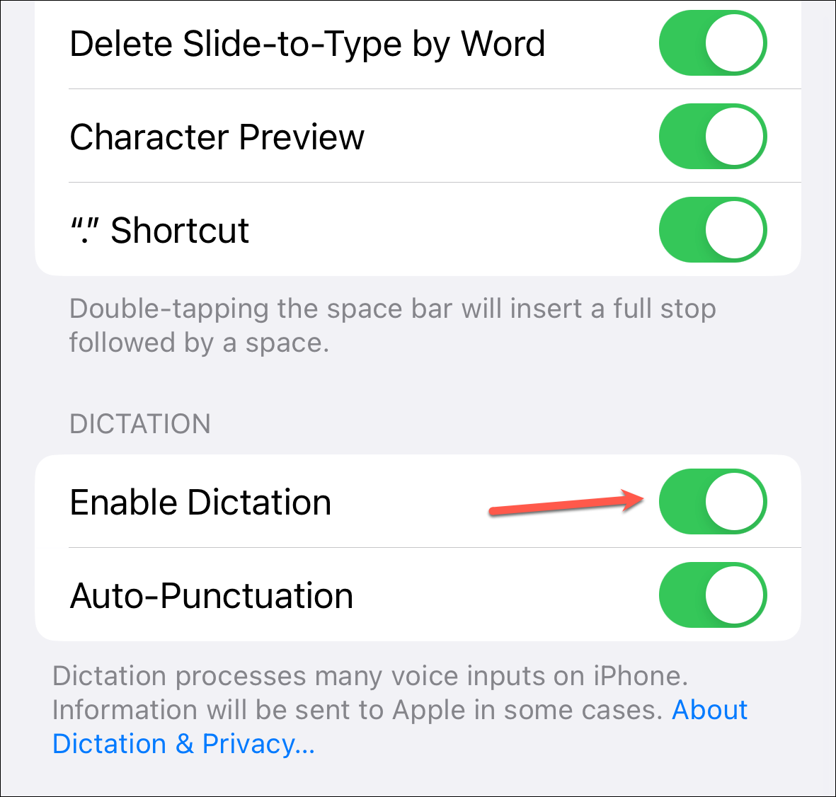Next, turn off the toggle for 'Enable Dictation', wait for a few seconds, and toggle the switch again to turn it on.