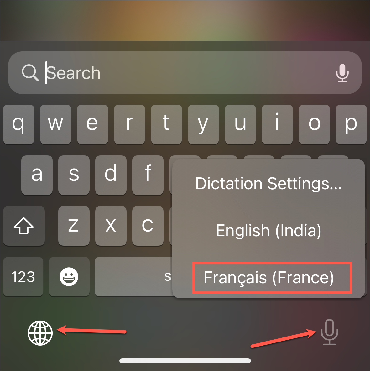 Now, next time you want to dictate in that language, make sure you have selected that keyboard. You can either press and hold the 'Globe' icon or the 'Dictation Microphone' icon to switch to the keyboard.