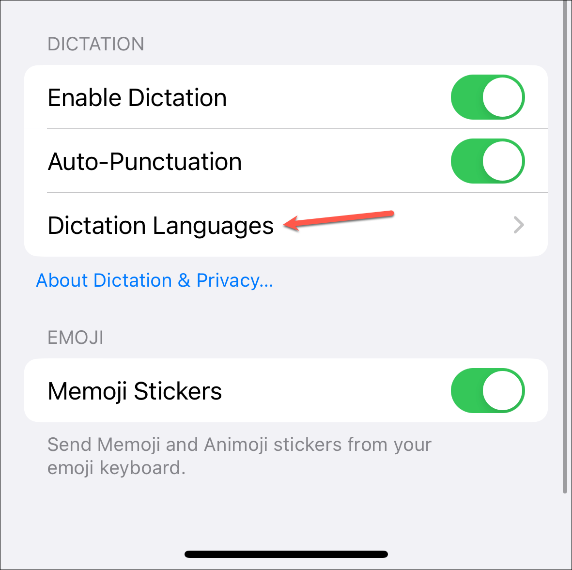 Go back to Keyboard settings and tap the option for 'Dictation Languages'.