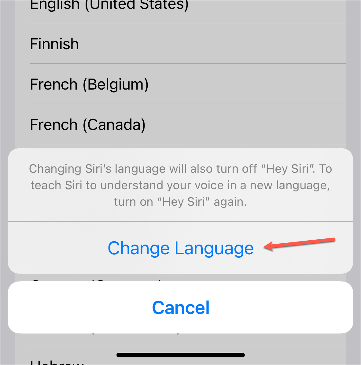 A confirmation prompt will appear, tap 'Change Language' to confirm. "Hey Siri" will also be turned off once you change the language; you'll need to re-enable it and set it up again.
