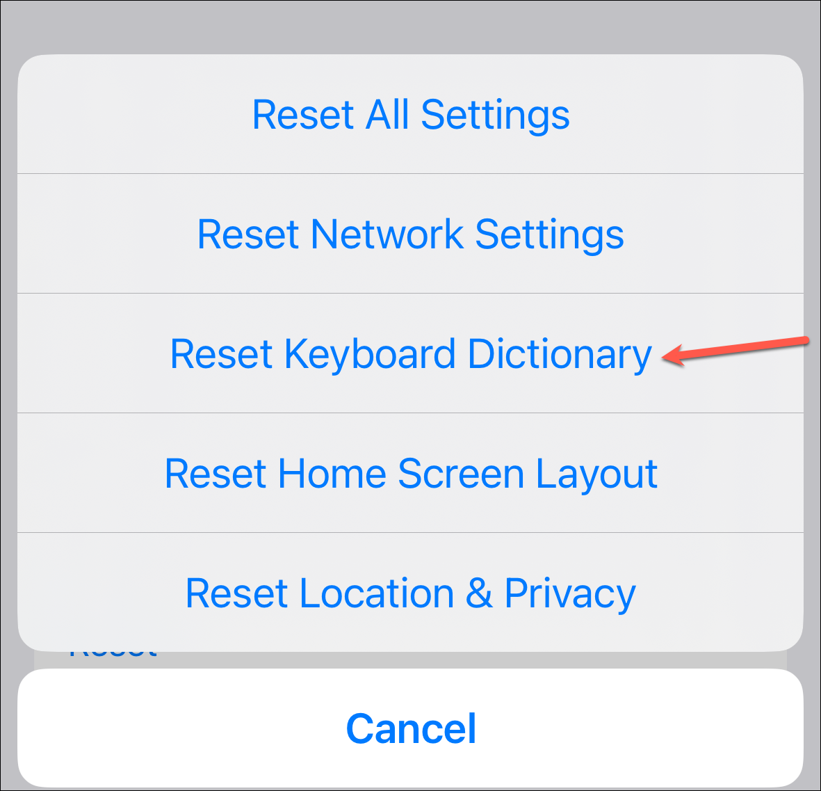 Then, tap the option for 'Reset Keyboard Dictionary' from the options that appear. If a confirmation prompt appears, confirm to proceed.