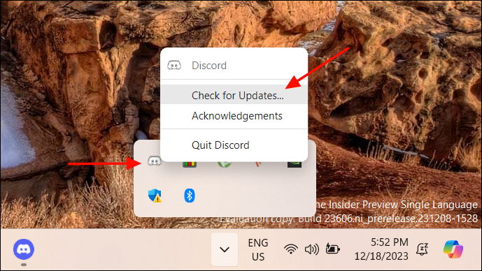 Alternatively, go to the system tray (up arrow icon) on the taskbar, right-click on the Discord icon, and select 'Check for updates'.