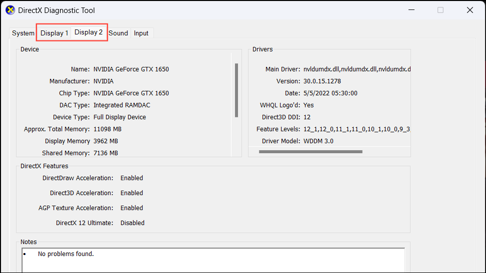 - In the DirectX Diagnostic Tool, check the 'Display 1' and/or 'Display 2' tab for graphics card information. If you have a dedicated and integrated graphics card, you would have Display 1 (Integrated graphics) and Display 2 (Dedicated graphics).
