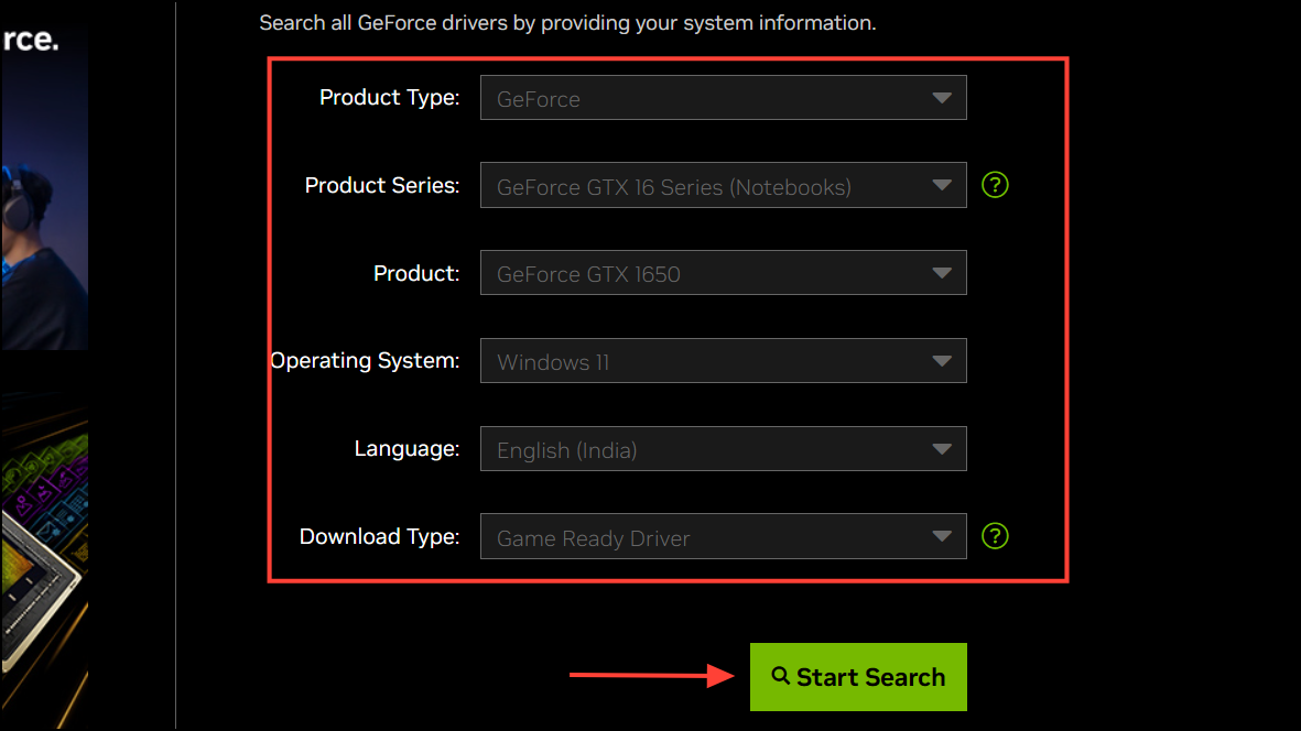 - Then, click 'Search' to find the correct Nvidia driver for your graphics.