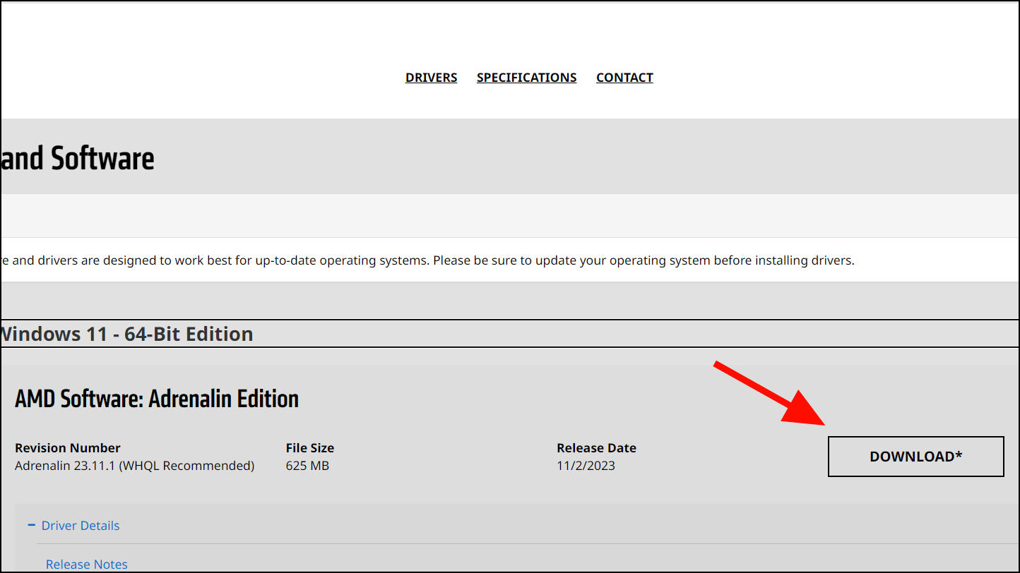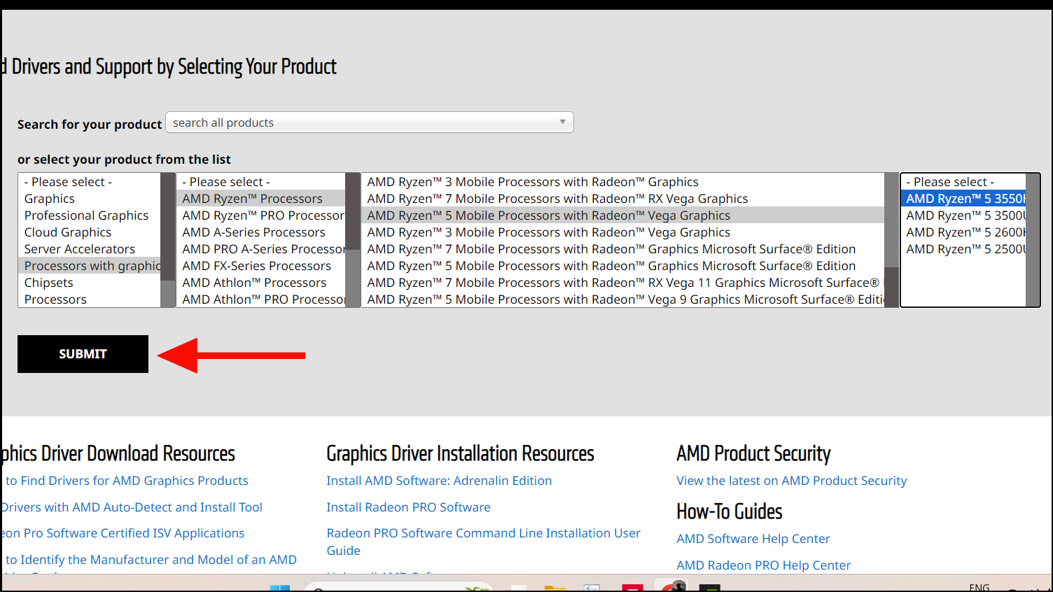 - For AMD graphics cards, go to the AMD Driver Support page, choose your specific GPU model from the product lists, and click 'SUBMIT'.