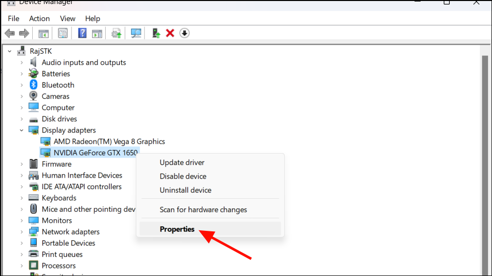 - Then, right-click the graphics card and select 'Properties'.