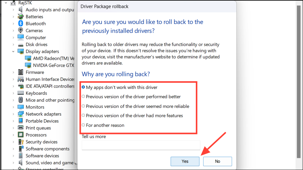 - Choose a reason for rolling back and click 'Yes'.