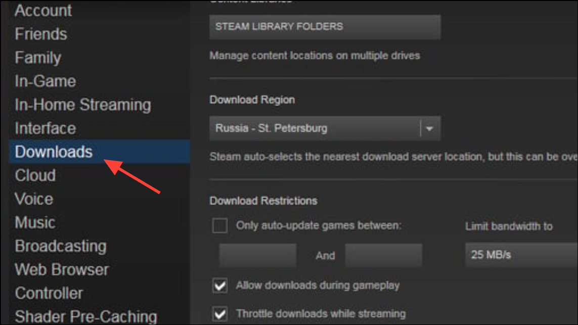Step 1: Open Steam and go to Steam > Settings > Downloads.