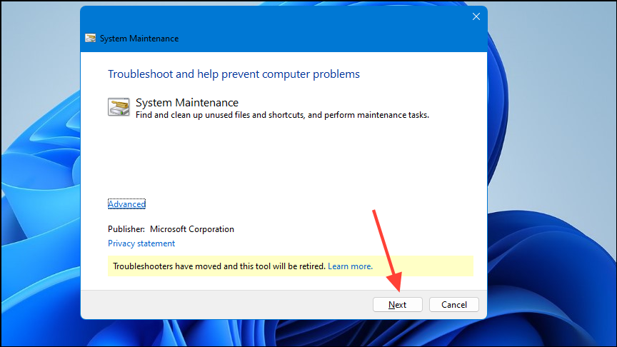 - The System Maintenance Troubleshooter will appear. Click on the 'Next' button.