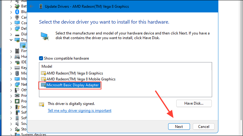 - Then select 'Microsoft Basic Display Adapter' from the list and then click on the 'Next' button.
