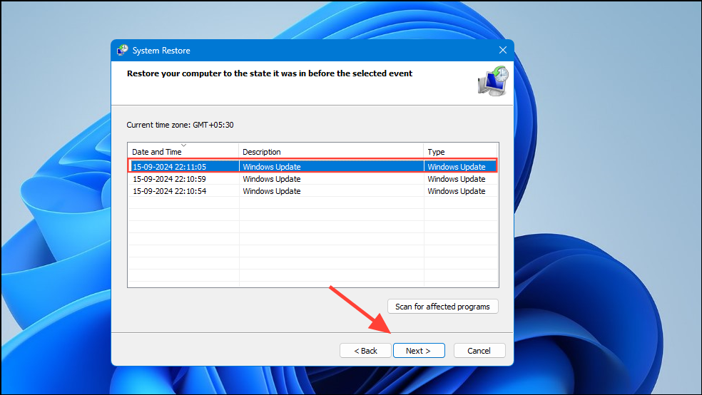 - You will see a list of available restore points. Click on the one you want to select and then click on the 'Next' button.