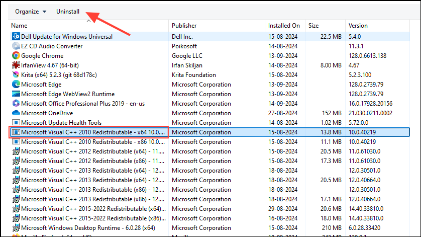- When the Programs and Features window opens, right-click on all Microsoft Visual C++ programs one by one and click on 'Uninstall' at the top.