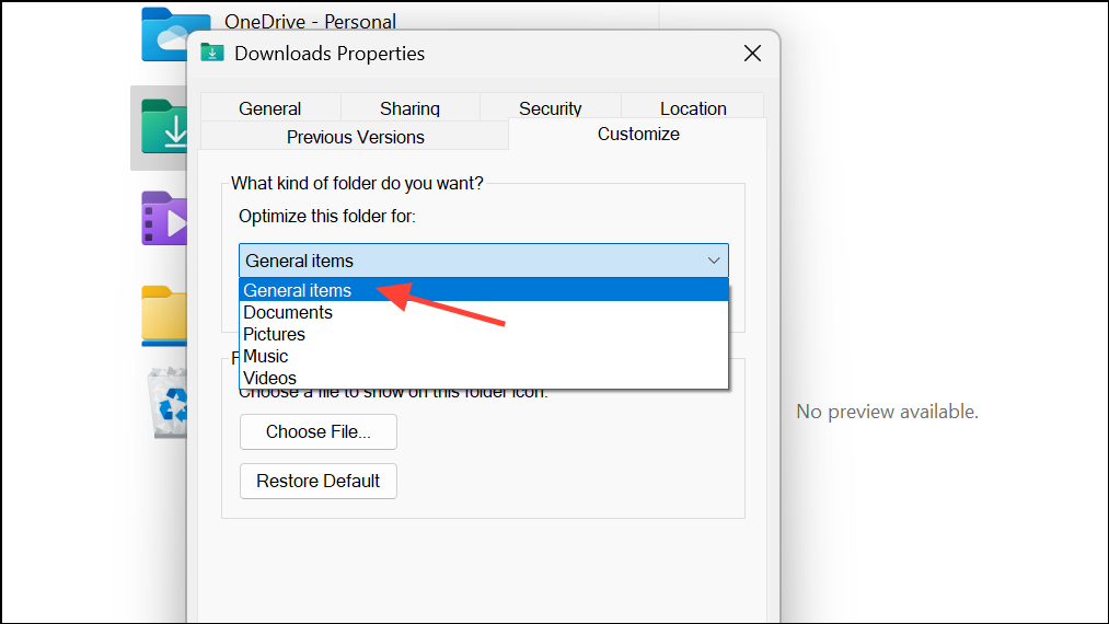 Step 2: Go to the Customize tab. Here, you’ll see a section labeled Optimize this folder for with a dropdown menu.