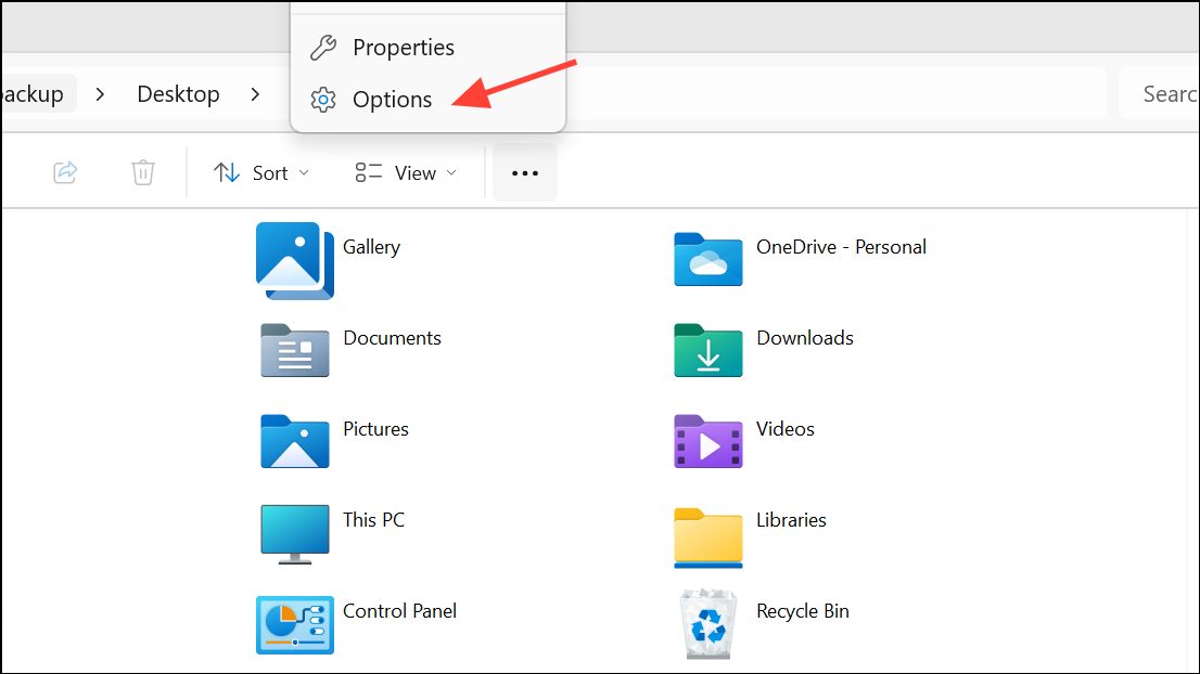 Step 1: Open File Explorer and click the three-dot menu at the top, then select Options.