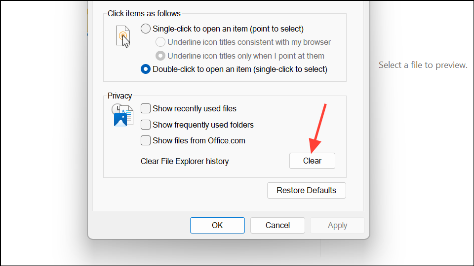 Step 3: Click the Clear button next to Clear File Explorer history.