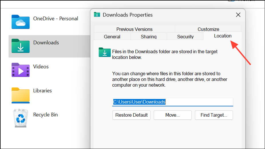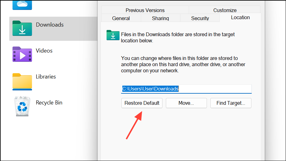 Step 3: Click Restore Default and confirm any prompts to move files back to the default location (C:\Users\[YourName]\Downloads).