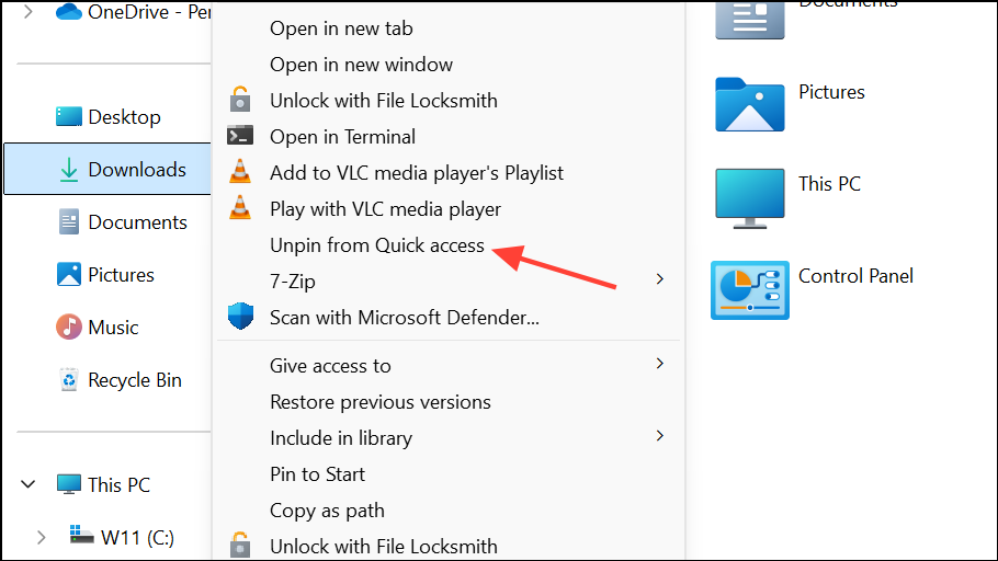 Step 1: In File Explorer, right-click the Downloads folder under Quick Access and select Unpin from Quick Access.