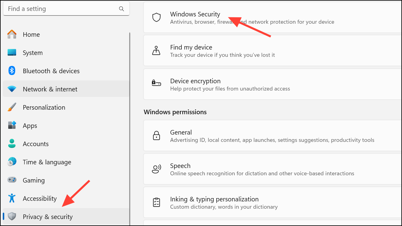Step 1: Open the Start menu and select Settings. Navigate to Privacy & Security, then choose Windows Security.