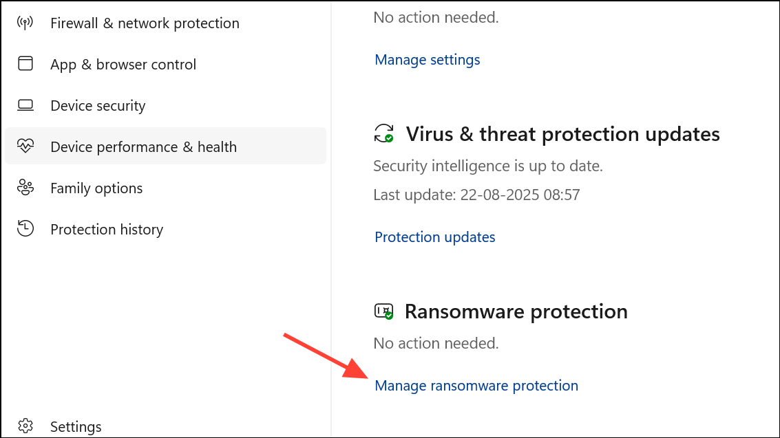 Step 2: Click Virus & threat protection on the right panel. Under Virus & threat protection settings, select Ransomware Protection and then Manage ransomware protection.
