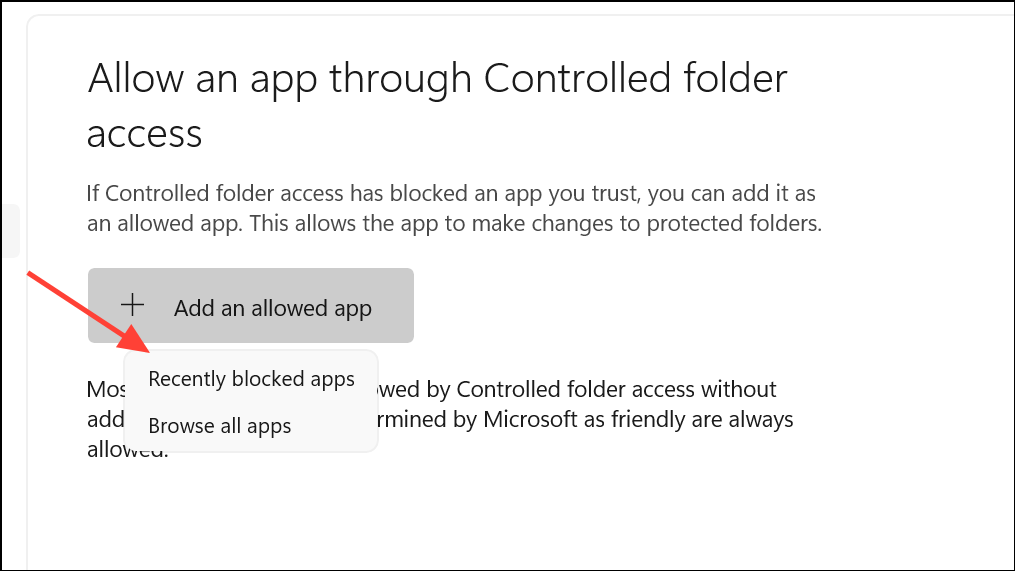 Step 3: Under Controlled folder access, click Allow an app through Controlled folder access. Choose Add an allowed app, then select Recently blocked apps. Locate and add DST.exe to the allowed list. This action permits DST.exe to access protected folders and stops the notification from reappearing at boot.