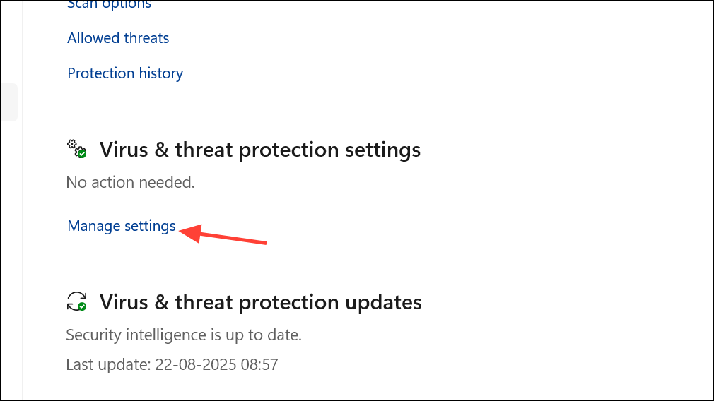 Step 1: In Windows Security, go to Virus & threat protection and select Manage settings under Virus & threat protection settings.