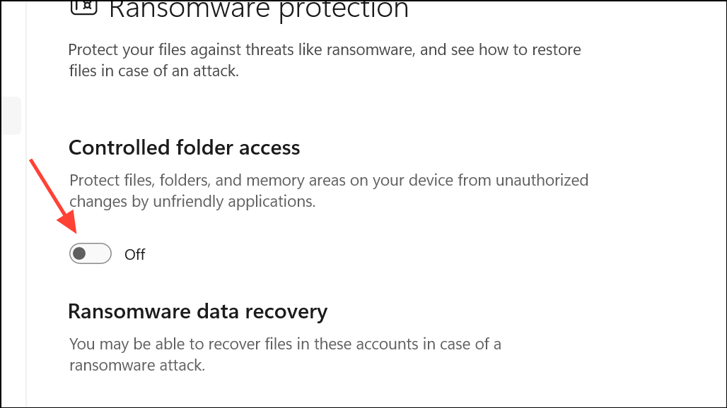 Step 1: If you are comfortable with Windows Security settings and are certain that DST.exe is safe, consider temporarily disabling Controlled Folder Access to confirm if it’s the source of the block. In Windows Security > Virus & threat protection > Ransomware Protection, toggle Controlled folder access to Off.
