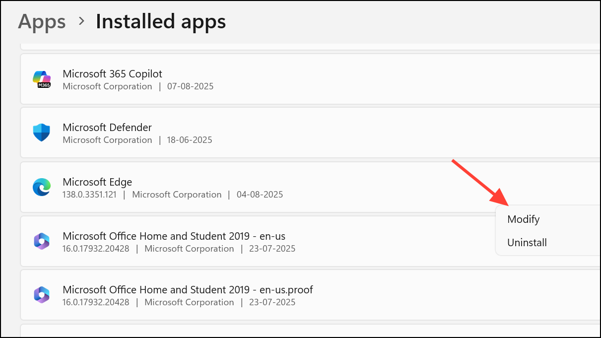 Step 3: Click the three-dot menu next to Edge and select "Modify" or "Repair." If "Repair" is unavailable, proceed to reset Edge settings.