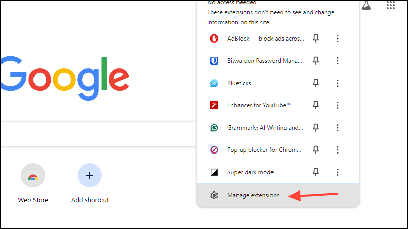 - Next, click on 'Manage extensions' in the dropdown menu.