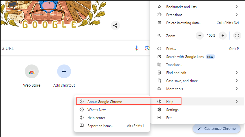 - When the pop-up menu appears, go to the 'Help' option and then click on 'About Google Chrome'.