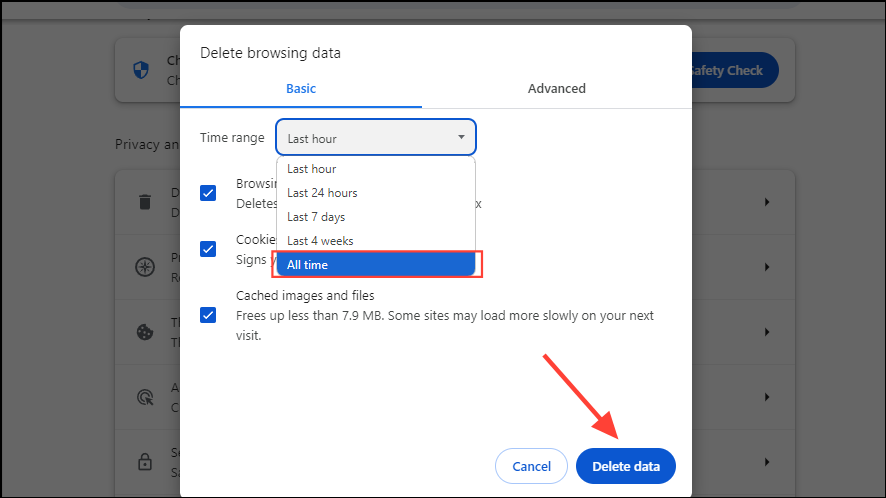 - Check that both 'Cookies and other site data' and 'Cached images and files' are selected. Then click on the dropdown menu and select 'All Time' before clicking on the 'Delete data' button.