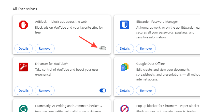 Browser extensions can get corrupted or may be outdated, preventing Chrome from loading websites properly. You can disable the extensions you have installed to try and get rid of the error.