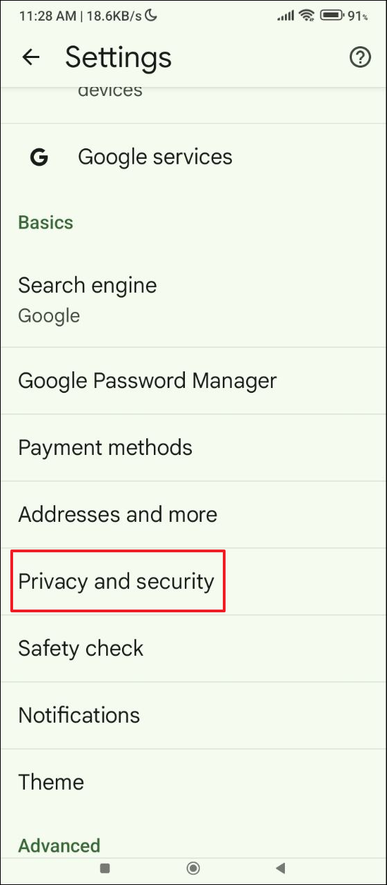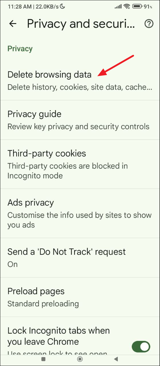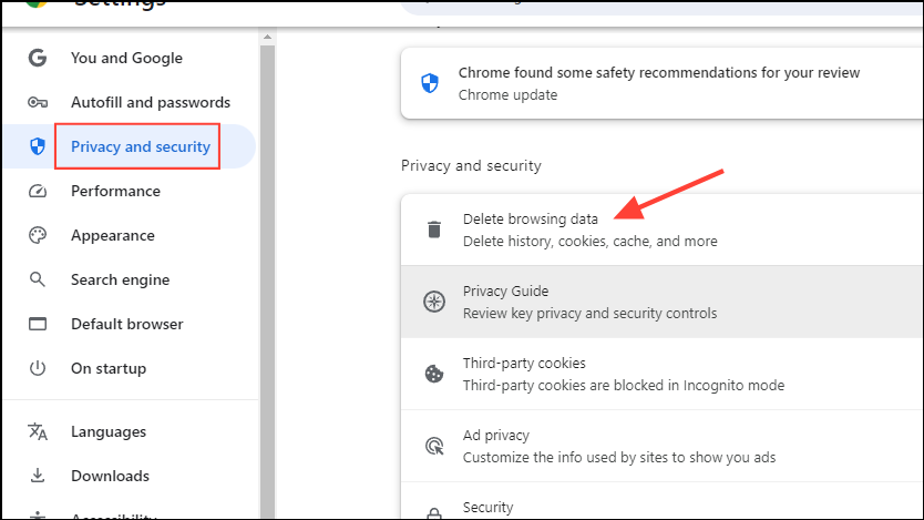 - On the Settings page, click on 'Privacy and Security' and then on 'Delete browsing data'.