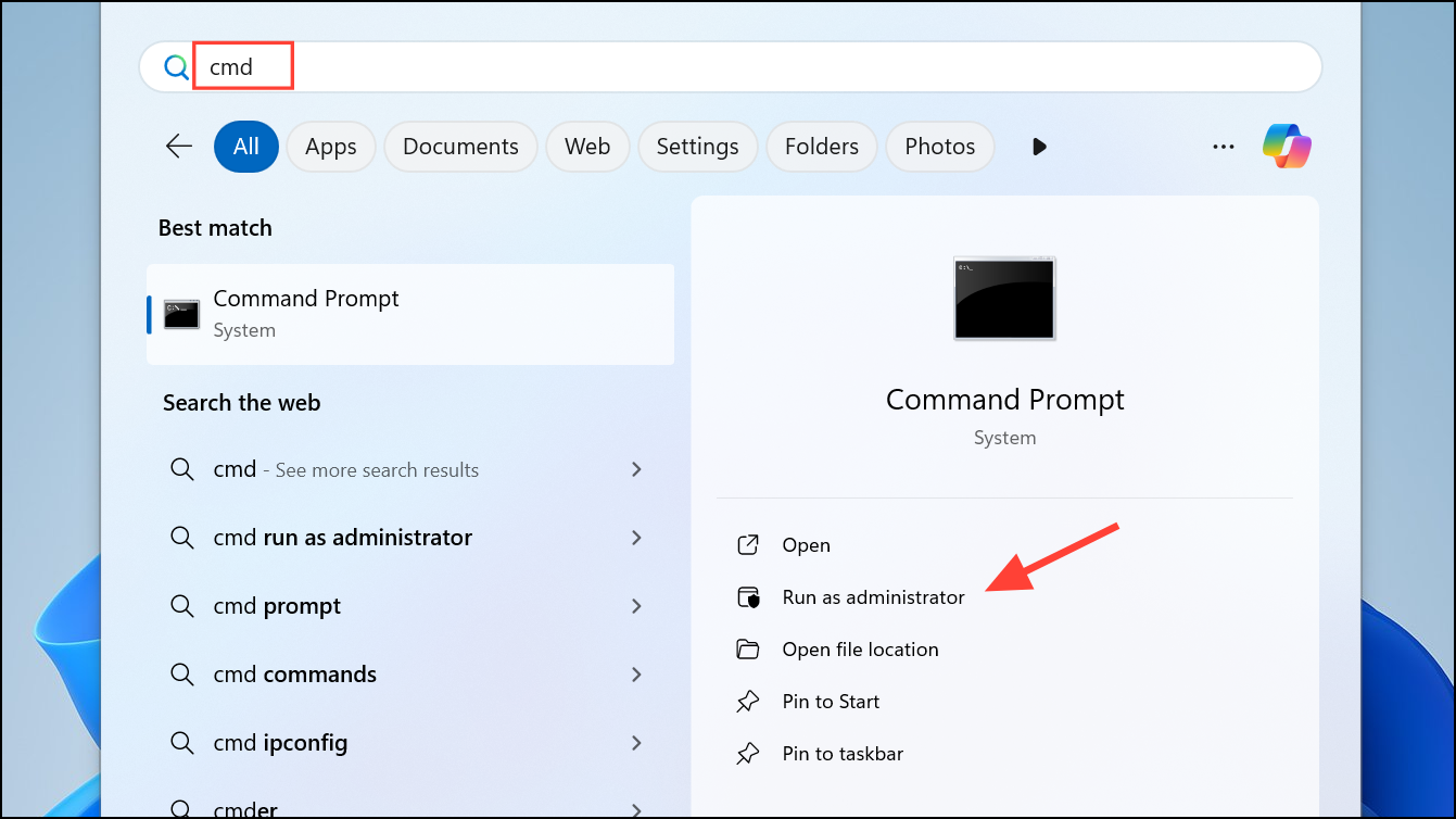 Step 1: Press the Win key, type cmd, right-click on Command Prompt, and select "Run as administrator."