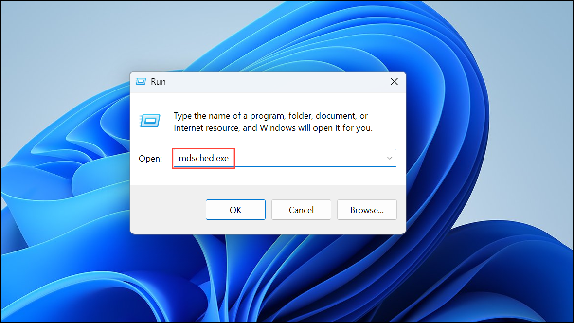 Step 1: Press the keyboard shortcut Win + R to open the Run dialog box. Then type mdsched.exe and press Enter.