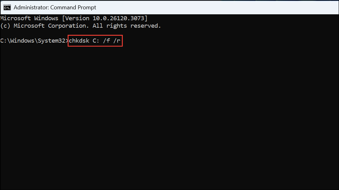Step 2: In the Command Prompt window, type the command chkdsk C: /f /r and press Enter. Replace C: with the appropriate drive letter if necessary.
