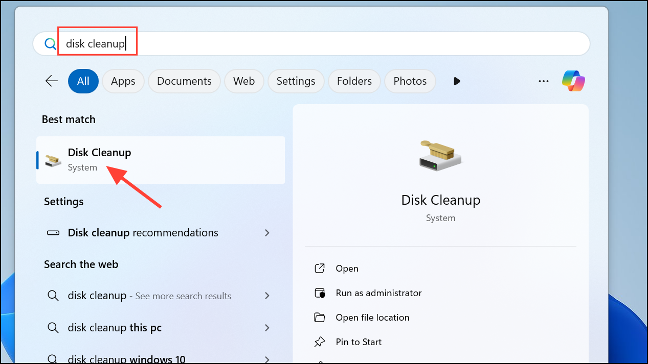 Step 1: Use the built-in Disk Cleanup tool by typing "Disk Cleanup" in the start menu search bar and hitting Enter.